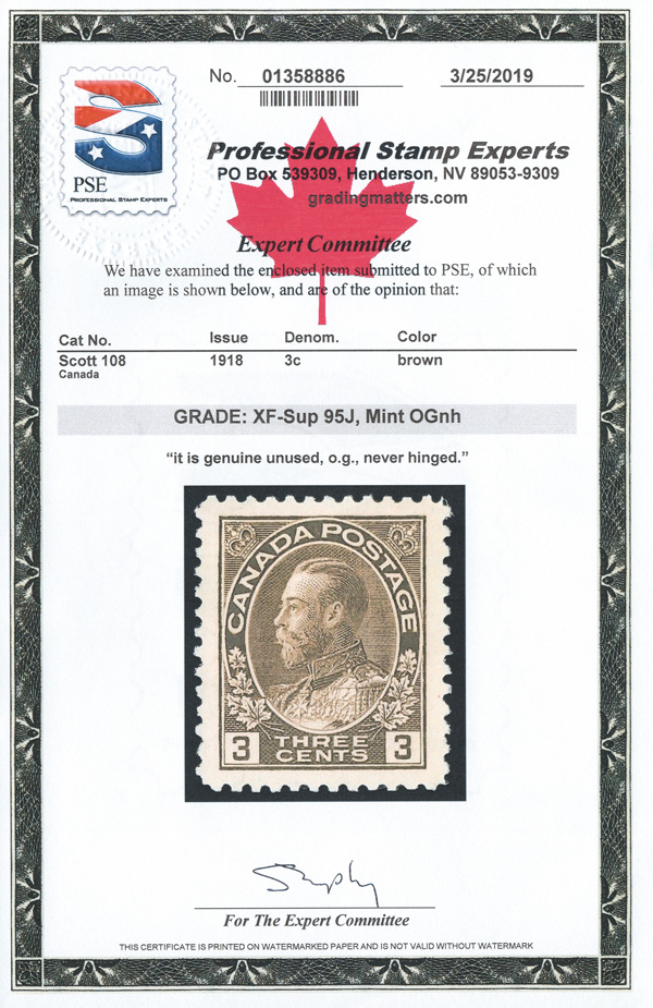 9503 nh 108 image1918, King George V "Admiral", 3¢ brown, wet printing (Scott 108), an exceptional mint Jumbo, o.g., never hinged, virtually perfectly centered and exceptionally fresh with extra wide margins, Extremely Fine to Superb, with a 2019 P.S.E. certificate graded XF-SUP 95.