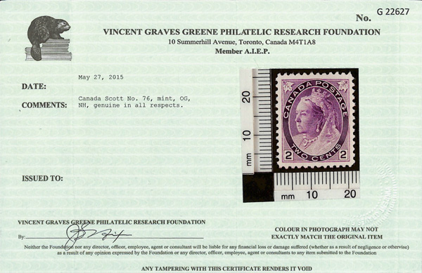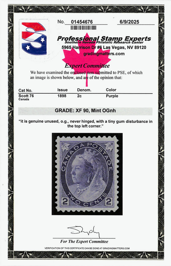 9484 nh 76 image1898, Queen Victoria "Numeral", 2¢ purple (Scott 76), o.g., never hinged, Post Office fresh with crisp color and sharp detail; tiny gum disturbance in top left corner, Extremely Fine, with 2015 Greene Foundation (clear) and 2025 P.S.E. certificates, the latter graded XF 90.