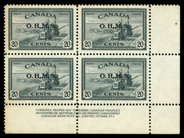 9538 O8 imageOfficial, 1949, 20c slate black 'O.H.M.S.' overprint (Scott O8), plate block of 6, o.g., never hinged; lightly toned, Extremely Fine.