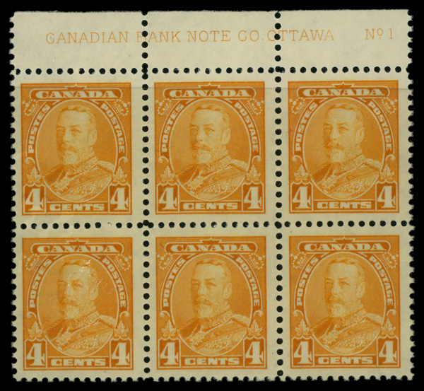 9529 nhbl 220 image1935, King George V, 4¢ yellowish orange (Scott 220), plate block of 6, o.g., never hinged.