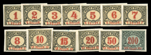 9555 og J1g-J13g image1904, Numerals 1h - 200h imperforated complete (Scott J1g-J13g), complete set of singles, o.g., hinged, Fine to Very Fine.