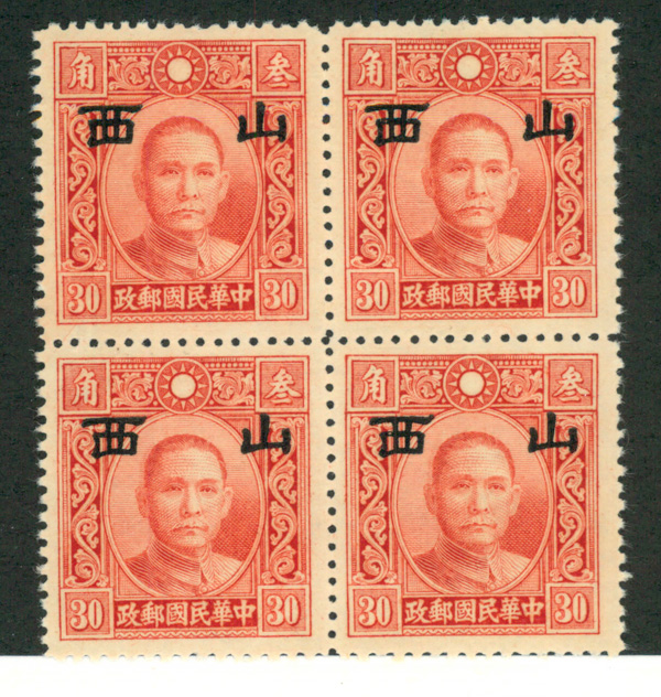 9568 nhbl 4N37a image1941, 30c scarlet Dr. Sun Yat-sen overprinted (Scott 4N37a), block of 4, o.g., never hinged, Fine to Very Fine.