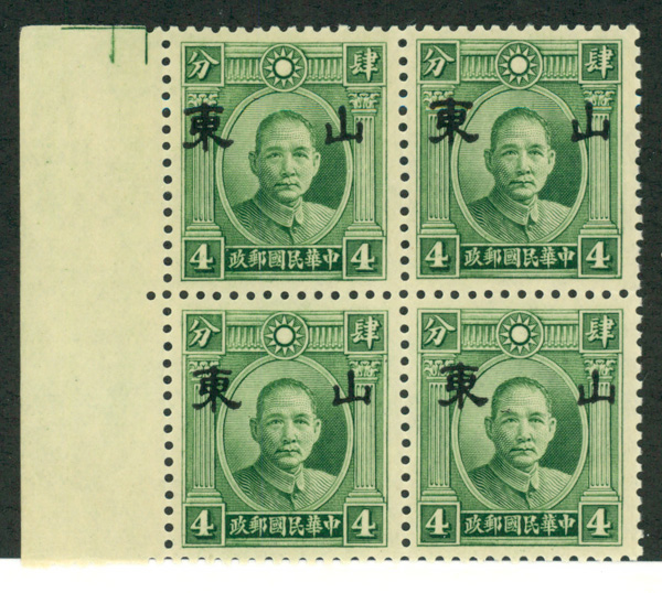 9573 nhbl 6N2a image19414c green Dr. Sun Yat-sen overprinted (Scott 6N2a), left margin block of 4, o.g., never hinged, Fine to Very Fine.