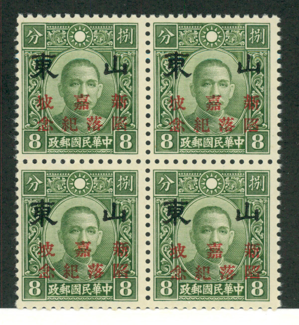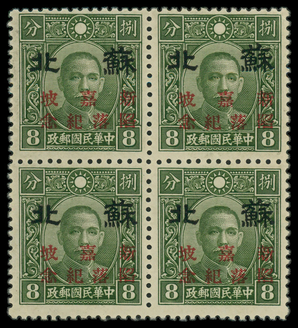 9586 nhbl 9N12 image1942-45, 8c olive green Dr. Sun Yat-sen surcharged (Scott 9N12), block of 4, o.g., never hinged, Fine to Very Fine.