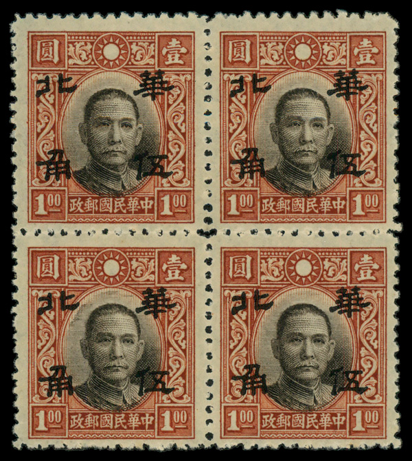 9580 nhbl 8N11 image1942, $1 henna & dark brown Dr. Sun Yat-sen overprinted (Scott 8N11), block of 4, o.g., never hinged, Fine to Very Fine.