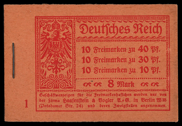 9678 BKng MH14.1A image1921, 8m Germania booklet (Michel MH14.1A), complete and unexploded, stuck down to interleaves, Fine to Very Fine.