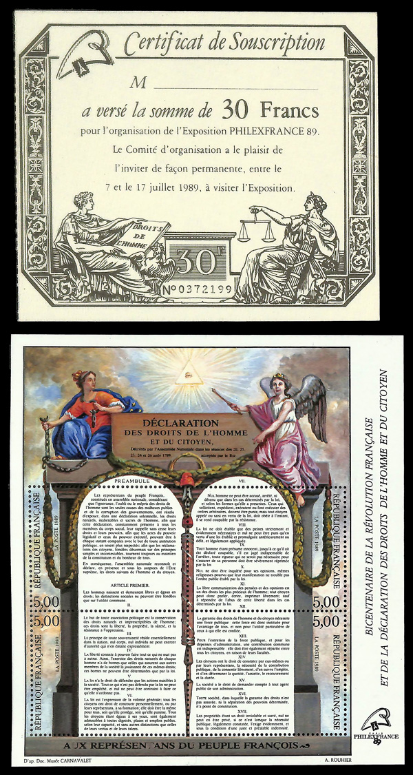 9662 nh 2168 var image1989, PHILEXFRANCE '89 souvenir sheet, flourescent paper (Scott 2168 var), with admission ticket from North American distribution., o.g., never hinged, Extremely Fine.