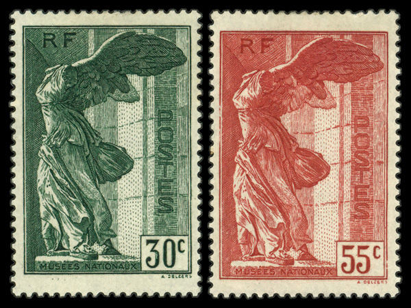 9664 og B66-B67 image1937, Winged Victory of Samothrace complete (Scott B66-B67), set of 2, singles, o.g., hinged, Fine to Very Fine.