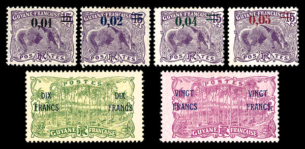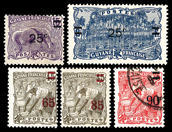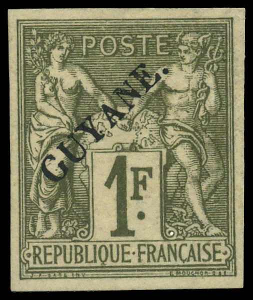9668 O 22 image1892, 10c black on lavender, 'GUYANE' diagonal overprint (Scott 22), Fine.