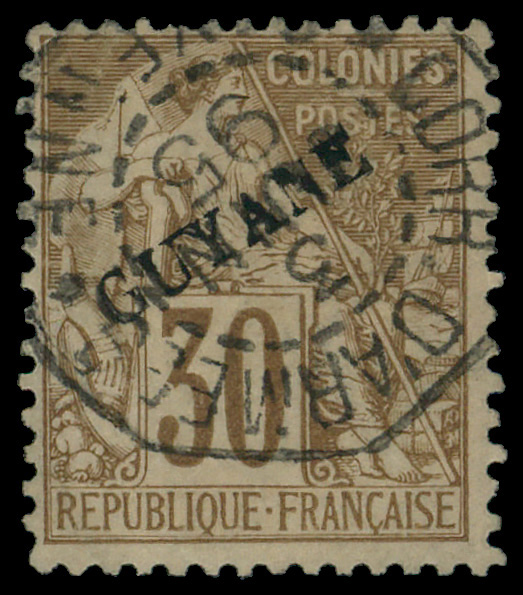 9669 O 26 image1892, 30c brown on bistre, 'GUYANE' diagonal overprint (Scott 26), Fine.