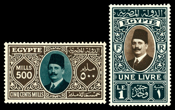 9642 og 148-149 image1932, King Fuad, 500m chocolate & Prussian blue and £1 dark green & orange brown (Scott 148-149), singles, o.g., lightly hinged, Fine to Very Fine.