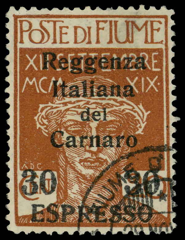 9652 O E4 image1920, Head of Fiume 20c brown orange overprinted and surcharged (Scott E4), single, Fine to Very Fine.
