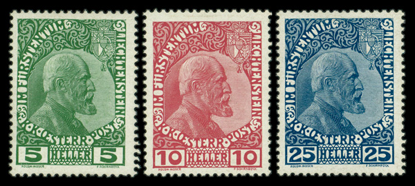9755 og 1-3 image1912, Prince Johann II, chalky paper, 5h to 25h complete (Scott 1-3), set of 3, complete set of singles, o.g., hinged, Fine to Very Fine.