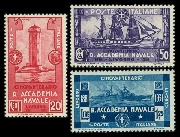 9724 nh 265-267 image1931, 5oth anniversary of the Royal Naval Academy at Leghorn (Livorno) complete (Scott 265-267), complete set of singles, o.g., never hinged, Fine to Very Fine.