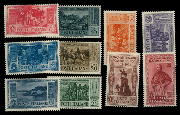 9725 og 280-289 image1932, 50th anniversary of the death of Giuseppe Garibaldi complete (Scott 280-289), complete set of singles, o.g., hinged, Fine to Very Fine.