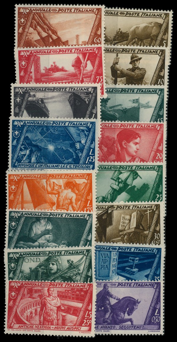 9726 og 290-305 image1932, 10th anniversary of the Fascist government and the March on Rome complete (Scott 290-305), complete set of singles, o.g., hinged, Fine to Very Fine.