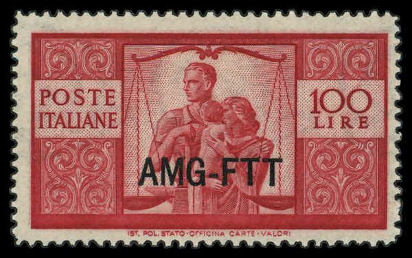 9733 nh 69 image1949-50, 100l carmine lake United Family and Scales overprinted (Scott 69), single, o.g., never hinged, Fine to Very Fine.