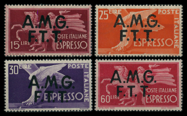 9736 nh E1-E4 image1947-48, Winged Foot and Rearing Horse and Torch Bearer complete overprinted (Scott E1-E4), complete set of singles, o.g., never hinged, Fine to Very Fine.