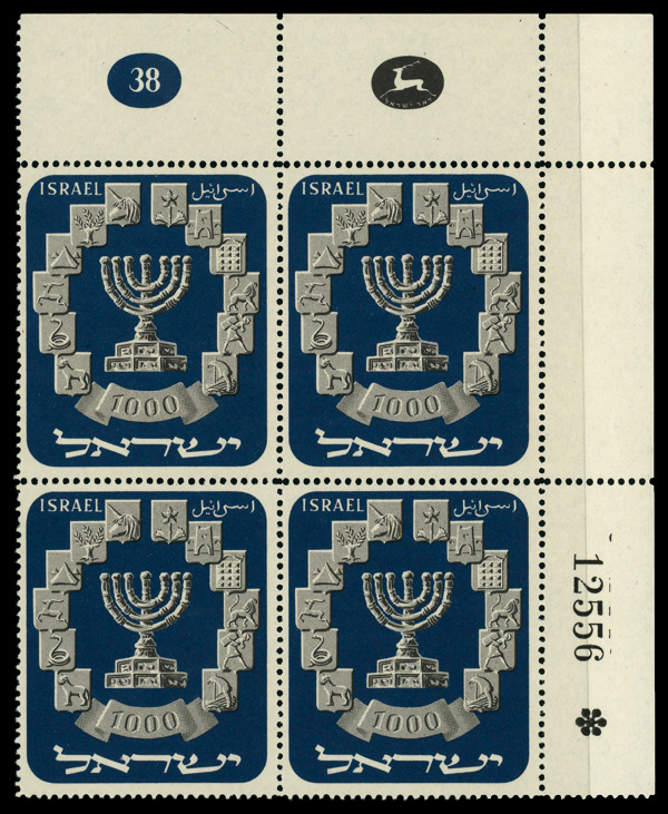 9721 nhbl 55 image1952, 1000p Menorah (Scott 55), plate block of 4, o.g., never hinged, Very Fine.