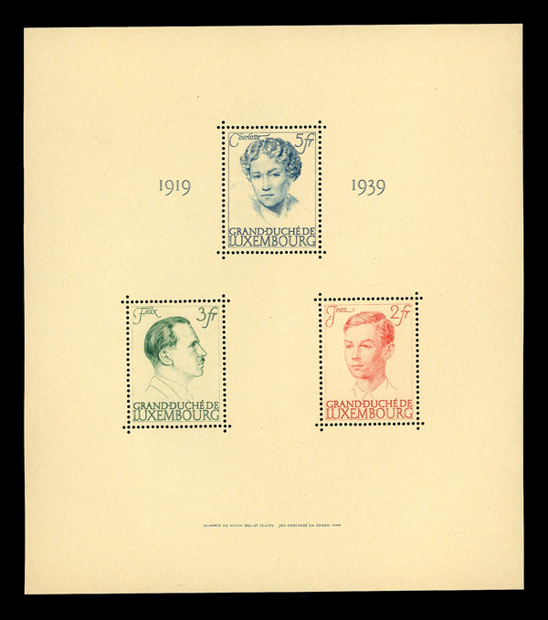 9758 nh 217 image1939, Reign Anniversary of Grand Duchess Charlotte, souvenir sheet of 3 (Scott 217), o.g., never hinged, Extremely Fine.