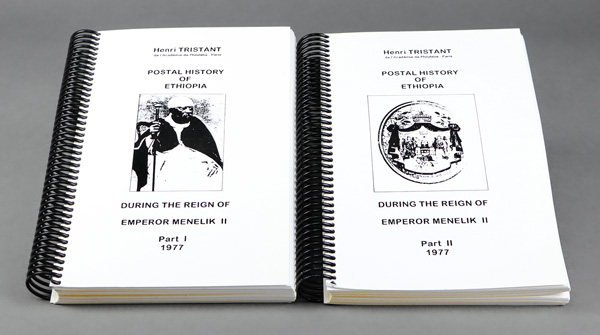9895 L tristant postal history of ethiopia imageTristant, Henri, Postal History of Ethiopia During the Reign of Emperor Menelik II, two-volume spiral-bound set, 512 pp. in total; clean and sound. Shipping charges apply - weight 2.1 lbs. (Image) Suggested Bid $5