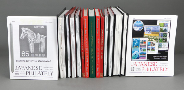 9896 japanese philately imageInternational Society for Japanese Philately, Japanese Philately, a decade of publications organized in binders by year with a few more recent; hardbound indexes for 1946-1972 (1-27), 1973-1977 (28-32), 1946-1990 (2 copies), and 1946-2005 (1-60); a must for the serious collector. Shipping charges apply - weight 30 lbs. (Image) Suggested Bid $54
