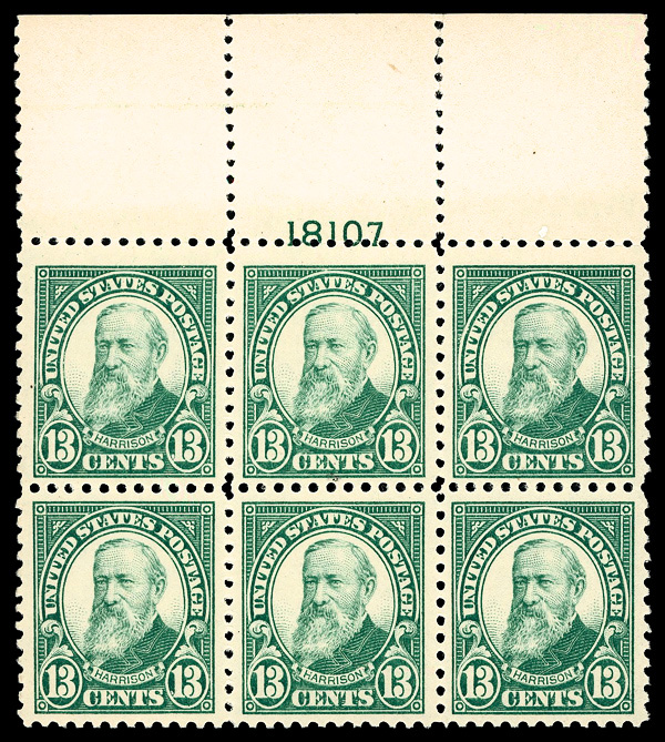 9154 nhbl 622 image1926, 13¢ Harrison (Scott 622), top margin plate block of 6, bottom stamps are very well centered, o.g., never hinged; tiny inclusion on top center stamp, Fine to Very Fine.