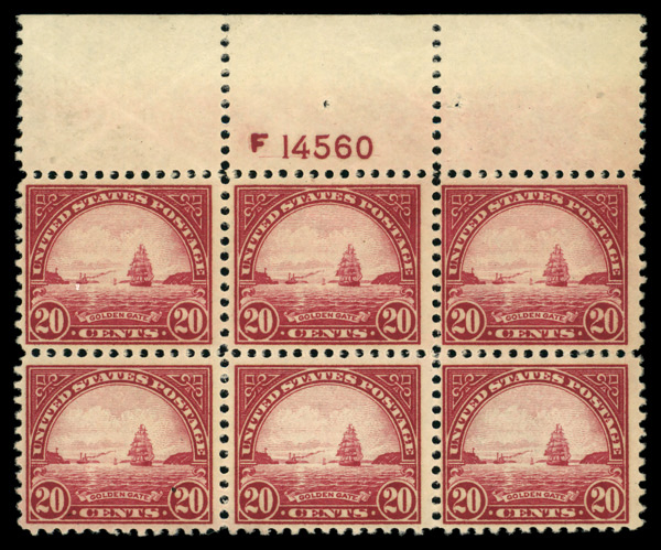 9136 nhbl 567 image1923, 20¢ Golden Gate (Scott 567), plate block of 6, o.g., never hinged, Fine to Very Fine.