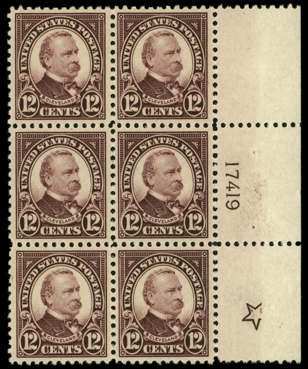 9132 nhbl 564 image1923, 12¢ Grover Cleveland (Scott 564), right margin plate block of 6 with five point star, Handsome bright visual tone, o.g., never hinged, Very Fine to Extremely Fine with several well centered stamps at left.