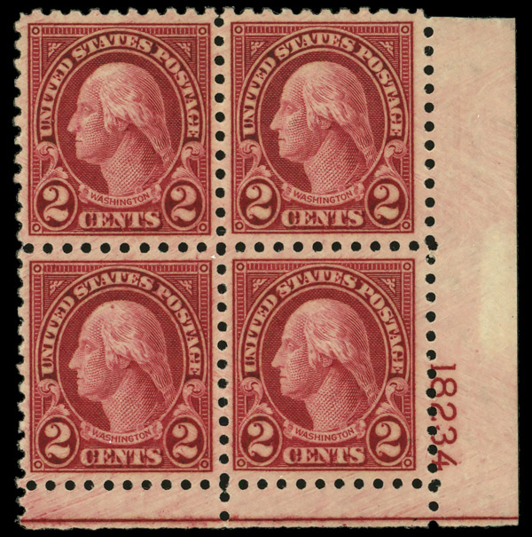 9144 nhbl 583 image1924, 2¢ Washington, rotary press printing, perf. 10 (Scott 583), bottom right plate block of 4, right stamps have very large and well centered margins, o.g., never hinged, Very Fine to Extremely Fine.