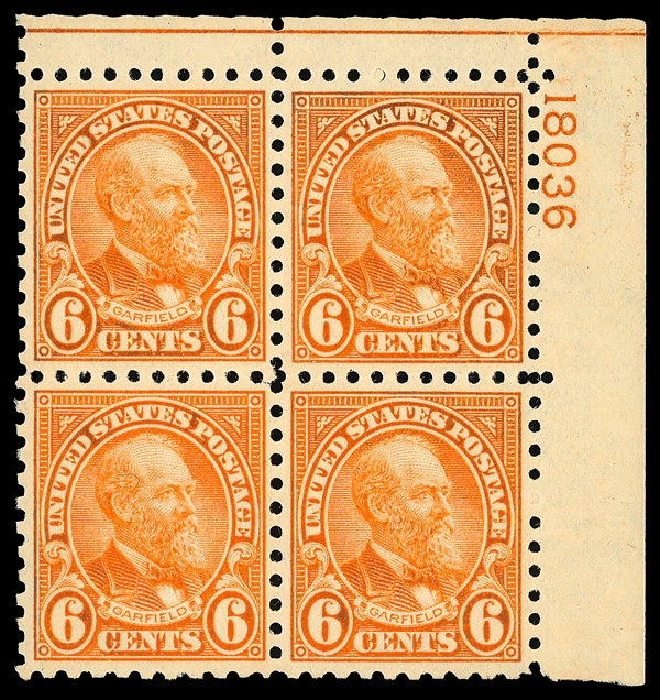 9145 nhbl 587 image1925, 6¢ Garfield, rotary press printing, perf. 10 (Scott 587), top right plate number 18036 block of 4, o.g., never hinged, a lovely, like-new plate, sound and well centered, Very Fine.