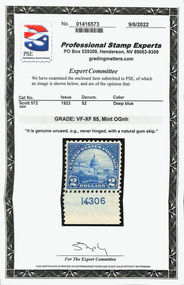 9141 nh 572 image1923, $2 U.S. Capitol (Scott 572), bottom margin single with plate number, Deep glowing ink color, o.g., never hinged; tiny natural gum skip, Very Fine to Extremely Fine, with 2022 P.S.E. certificate graded VF-XF 85.