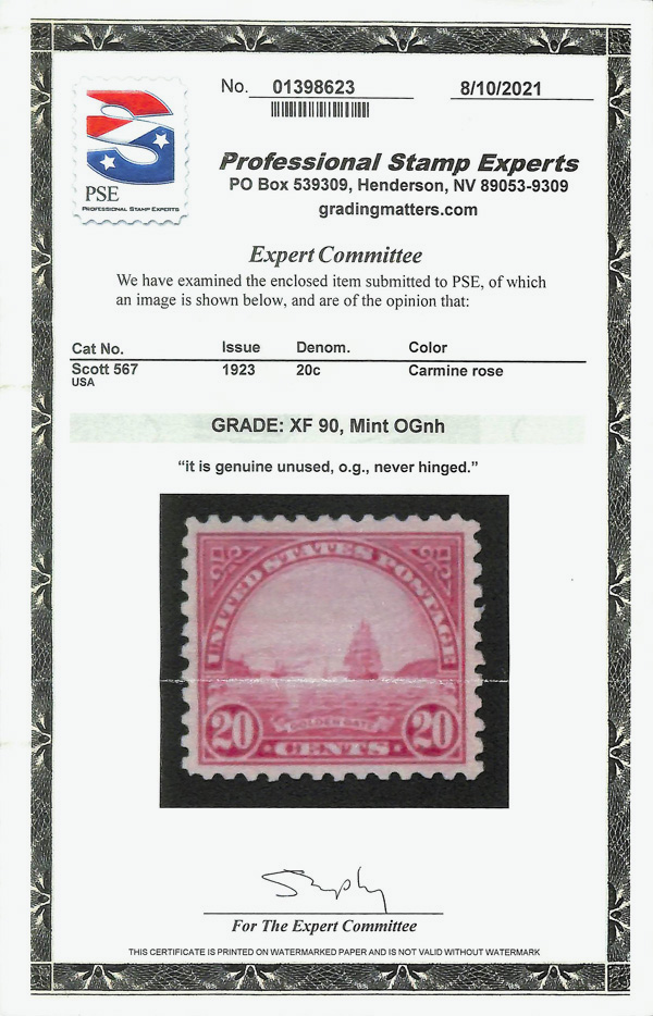 9135 nh 567 image1923, 20¢ Golden Gate (Scott 567), Clear, boldly inked color, o.g., never hinged, Extremely Fine, with 2021 P.S.E. certificate graded XF 90.