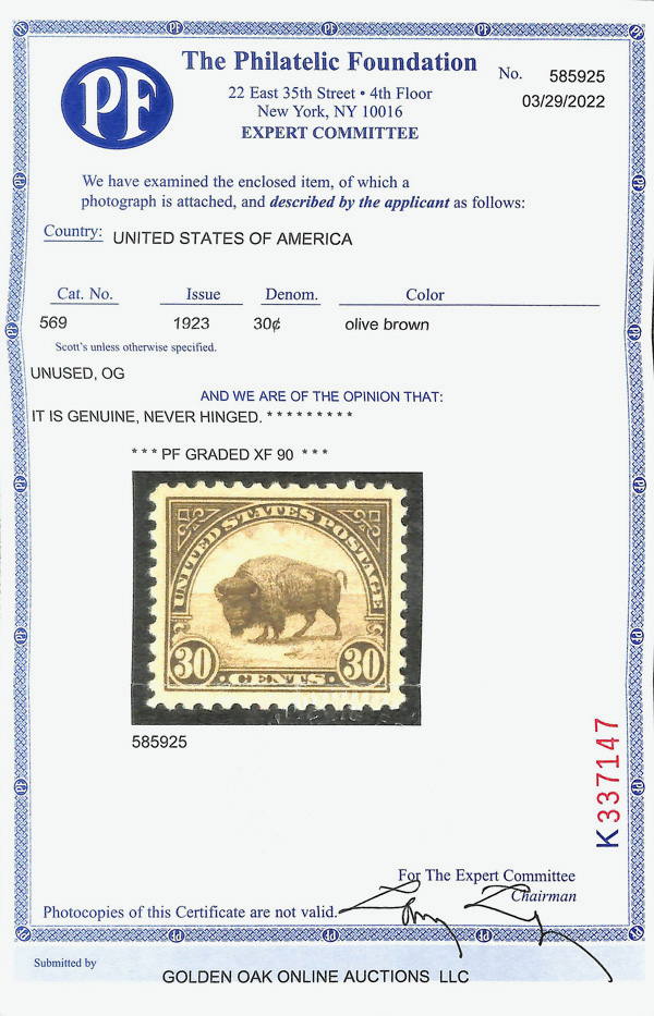 9138 nh 569 image1923, 30¢ American Buffalo (Scott 569), Deep fresh hue retained, o.g., never hinged, Extremely Fine, with 2022 P.F. certificate graded XF 90.