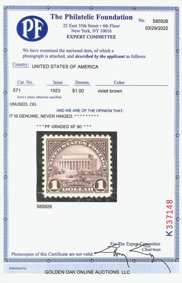 9140 nh 571 image1923, $1 Lincoln Memorial (Scott 571), Strong vivid color presence, o.g., never hinged, Extremely Fine, with 2022 P.F. certificate graded XF 90.