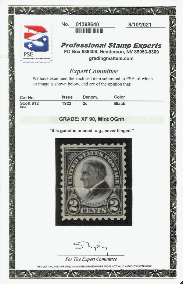 9149 nh 612 image1923, 2¢ Harding, rotary press printing, perf. 10 (Scott 612), Vibrant printing with clarity, o.g., never hinged, Extremely Fine, with 2021 P.S.E. certificate graded XF 90.