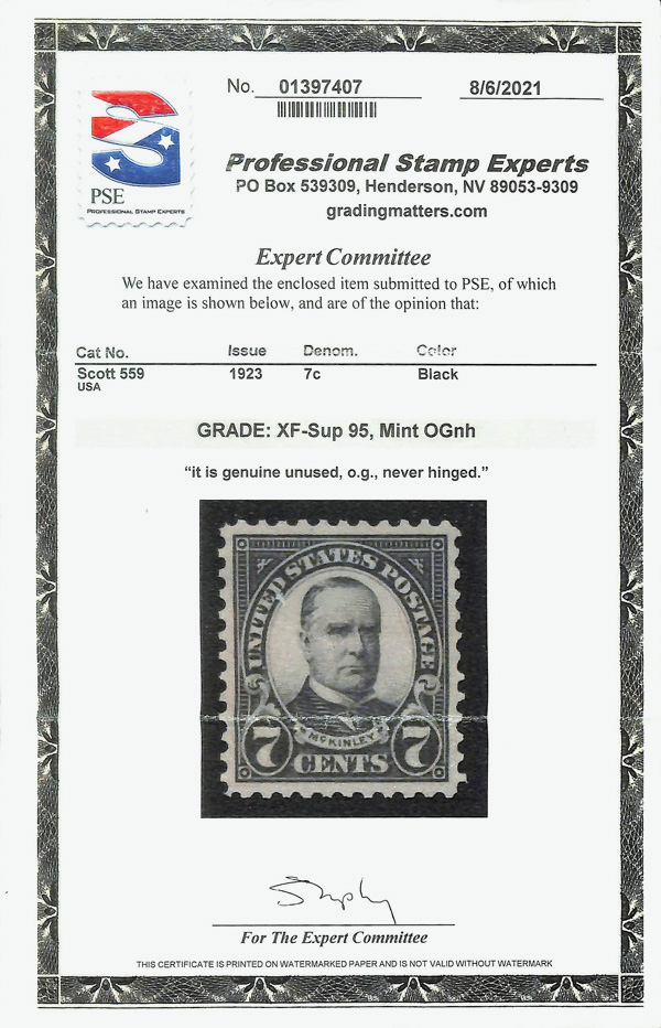 9125 nh 559 image1923, 7¢ McKinley (Scott 559), Clean bright printed detail, o.g., never hinged, Extremely Fine to Superb, with 2021 P.S.E. certificate graded XF-SUP 95.