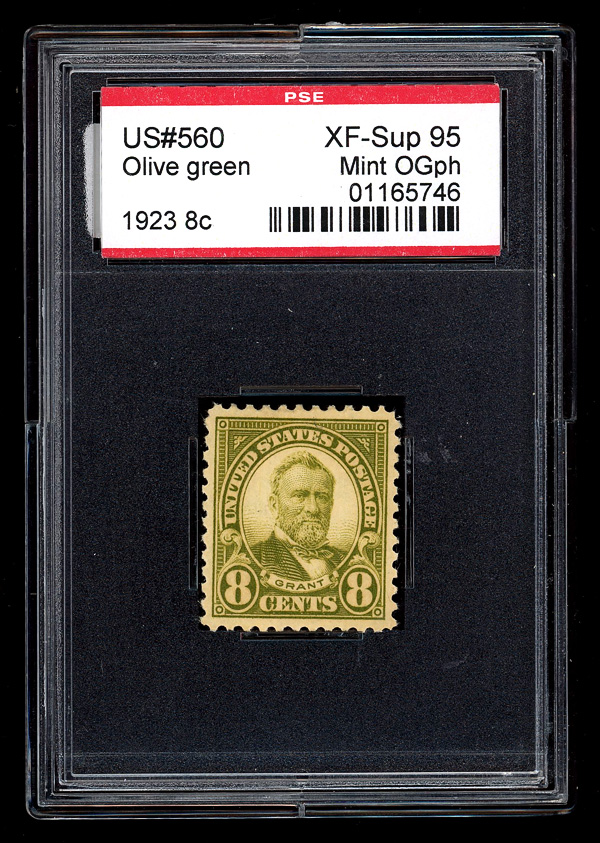 9127 og 560 image1923, 8¢ Grant (Scott 560), Lovely, even color tone, o.g., previously hinged, Extremely Fine to Superb, with P.S.E. encapsulated certificate graded XF-SUP 95.
