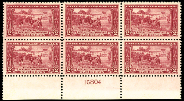 9153 nhbl 619 image1925, 5¢ Lexington-Concord (Scott 619), top margin F plate block of 6, Beautiful clean freshness, bottom stamps well centered, o.g., never hinged, Very Fine.