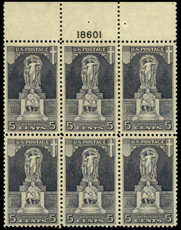 9156 nhbl 628 image1926, 5¢ Ericsson (Scott 628), plate block of 6, o.g., never hinged, Very Fine to Extremely Fine.
