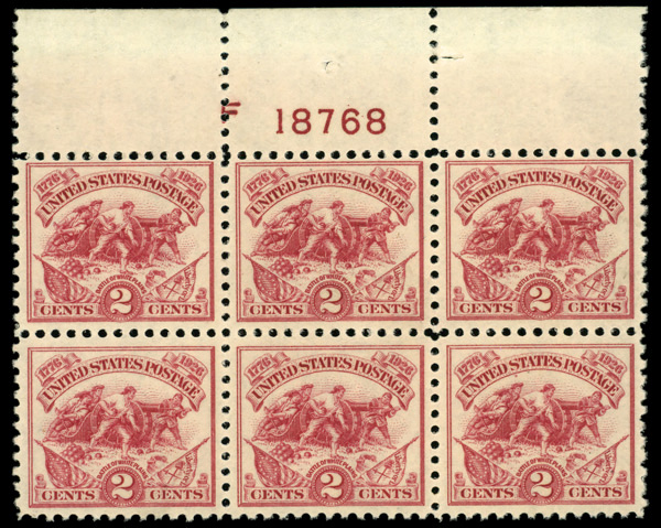9155 nhbl 627 image1926, 2¢ Sesquicentennial Exposition (Scott 627), plate block of 6, o.g., never hinged, Extremely Fine.