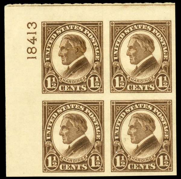 9159 nhbl 631 image1926, 1½¢ Harding, rotary press printing, imperf. (Scott 631), plate block of 4, o.g., never hinged, Very Fine to Extremely Fine.