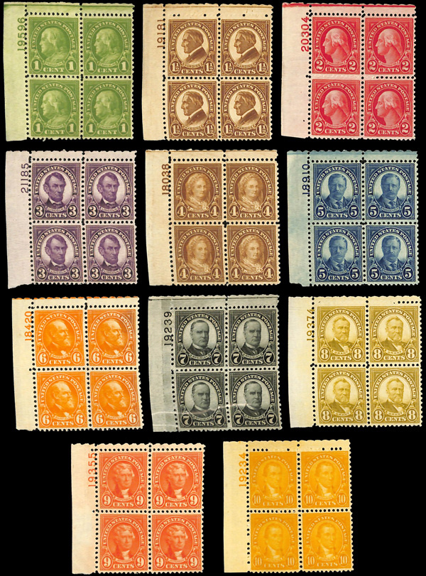 9160 nhbl 632-634, 635-642 image1926-34, Rotary press definitives, perf. 11 x 10½ 1¢ to 10¢ complete (Scott 632-634, 635-642), set of 11, plate blocks of 4, o.g., never hinged, Very Fine to Extremely Fine.
