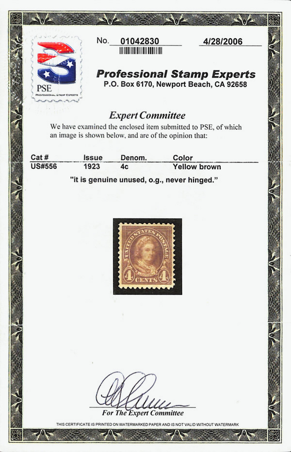 9122 nh 556 image1923, 4¢ Martha Washington (Scott 556), o.g., never hinged, Very Fine, with 2006 P.S.E. certificate.