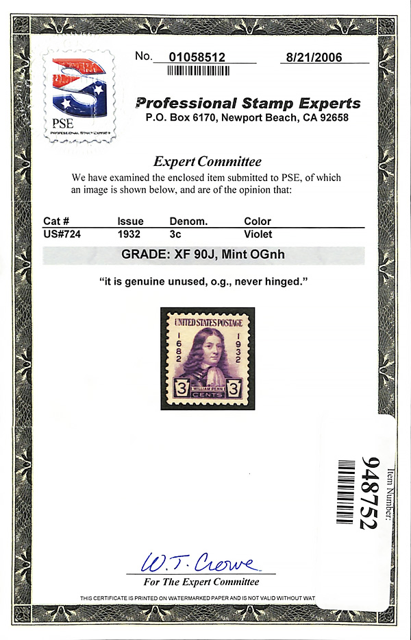 9188 nh 724 image1932, 3¢ William Penn (Scott 724), o.g., never hinged, Extremely Fine, with 2006 P.S.E. certificate graded XF 90J.
