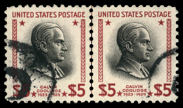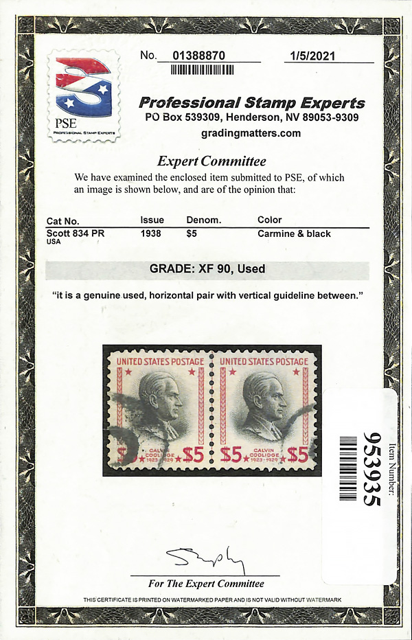 9199 O 834 image1938, Presidential Issue, $5 Coolidge (Scott 834), horizontal pair with guide line, Extremely Fine, with 2021 P.S.E. certificate graded XF 90.