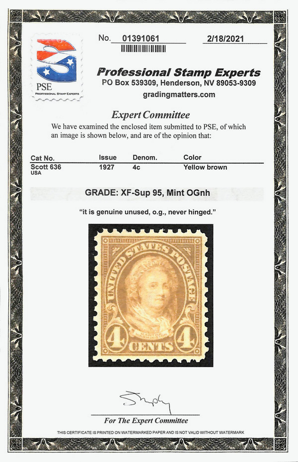 9164 nh 636 image1927, 4¢ Martha Washington, rotary press printing (Scott 636), gargantuan margins frame the design, o.g., never hinged, Extremely Fine to Superb, with 2021 P.S.E. certificate graded XF-SUP 95.
