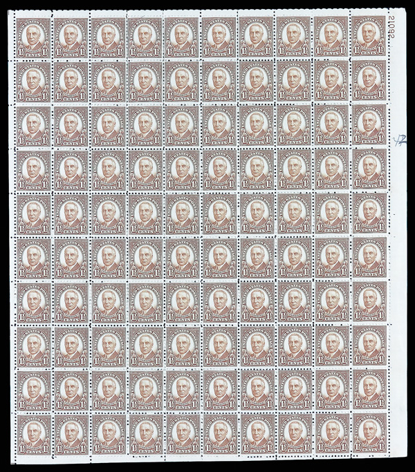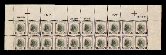 9197 nhbl 832 image1938, Presidential Issue, $1 Wilson (Scott 832), plate block of 20, o.g., never hinged, Very Fine.