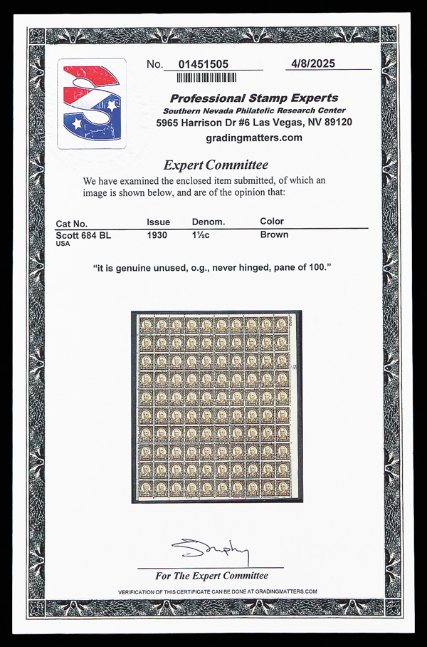 9180 nhbl 684 image1930, 1½¢ Harding, rotary press printing (Scott 684), top right full pane of 100 with plate number 21092, o.g., never hinged, sound and fresh with warm color, Fine to Very Fine, with 2025 P.S.E. certificate.