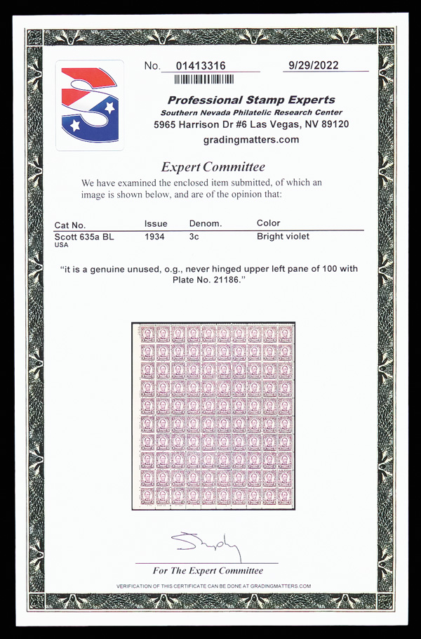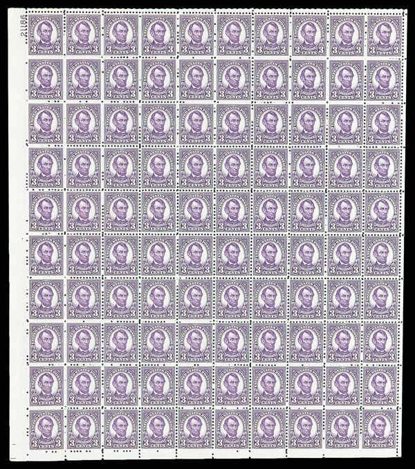 9163 nhbl 635a image1934, 3¢ Lincoln, bright violet, rotary press printing (Scott 635a), top left full pane of 100 with plate number 21186, o.g., never hinged, fresh and sound with vivid color and clean detail, Fine to Very Fine+, with 2022 P.S.E. certificate.